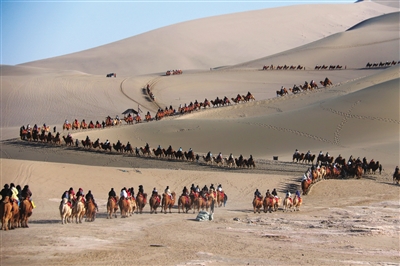 ■2024年春节迎来“8+1”假期,民众出游热情高涨,各地景区景点迎来参观热潮,文旅市场实现“开门红”。这是游客在甘肃省敦煌市鸣沙山月牙泉景区游览(2024年2月14日摄)。新华社 发