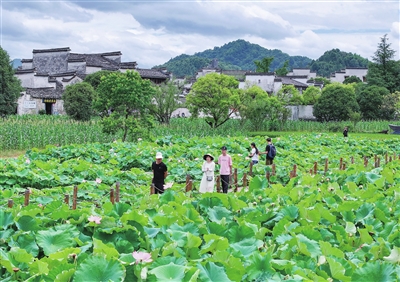 盛夏时节,安徽省黄山市黟县西递古村落景色宜人,古朴的徽州村落和宁静的田园风光吸引了众多游客前来赏景纳凉。