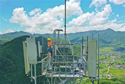 ■近日,在和平县浰源镇曲潭村,河源铁塔公司的工作人员顶着烈日,进行设备维护。本报记者 肖斌 摄