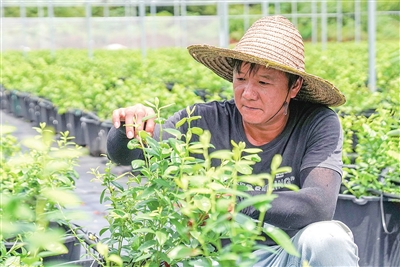 ■近日,东源县上莞镇冼川村二龙大棚蓝莓种植园里,技术员在烈日下精心管护蓝莓果苗。本报记者 杨坚 摄