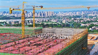 ■烈日当空,白象食品华南生产基地项目施工现场,建筑工人在紧张有序地施工。