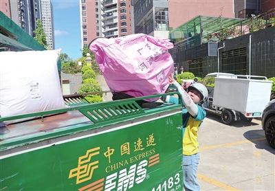 ■7月21日,邮政快递员在高温天气下配送快递包裹。 本报记者 肖斌 摄