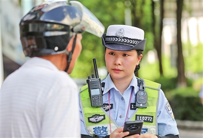 ■24日,我市发布高温橙色预警。市公安局源城分局交警大队女子中队民警坚守一线,为市民服务。 本报记者 冯晓铭 摄