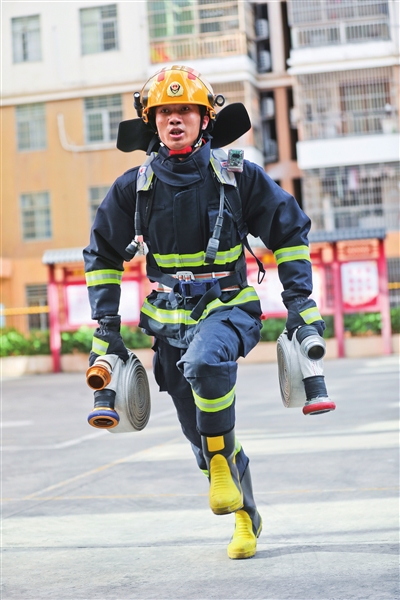 ■23日,源城区文昌消防救援站内,消防员顶着高温,穿上全套装备模拟救援训练。