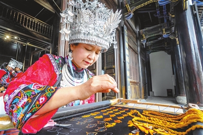 ■ 11月23日,重庆酉州苗绣市级传承人陈国桃在2025非遗品牌推广周上刺绣。