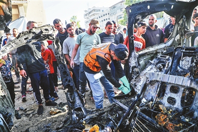 ■当地时间11月22日,在加沙城西部,加沙居民查看被以色列无人机炸毁的汽车。