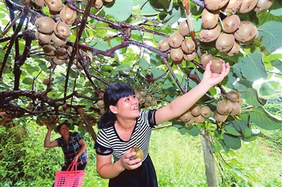 走进上坪村猕猴桃种植基地,散发着淡淡果香的猕猴桃挂满枝头。树下,来自周边的群众携家带口,三五成群地体验采摘猕猴桃的乐趣,欢笑声充盈了整个果园。