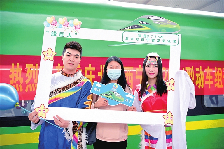 ■10月11日,在重庆北站,搭乘重庆北至西宁首趟“绿巨人”复兴号动车的旅客(中)与工作人员在发车前合影。 当日,D755次动车组列车从重庆北站始发,开往西宁。该动车组列车是有着“绿巨人”之称的新型时速160公里动力集中动车组。这是重庆首次开行“绿巨人”动车组列车到青海省。新华社 发