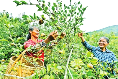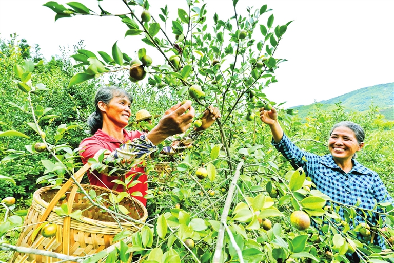 上坪镇石湖村神牛油茶山上,逾百亩的油茶林一派丰收景象,累累的茶果挂满了枝头。茶树下,则是一大早上山来摘茶果的村民(如图,冯晓铭 摄)。据悉,山茶油是石湖村“一村一品”特色产业,全村油茶种植面积4000多亩。自2016年开始,在帮扶单位的帮助下,通过对低产老茶树进行技术改造,油茶亩产值得到显著提升,2019年全村实现增收350万元,其中贫困户实现增收140万元,成为群众增收致富的主导产业。