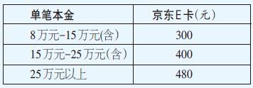 1.截至12月20日,汽车分期单笔本金8万元以上的客户,可按以下标准获得京东E卡(电子券,下同)。先到先得,每人限领一次。