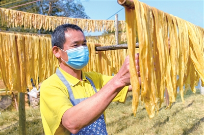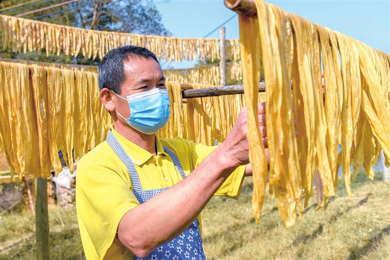 11月25日,天气晴好,上午10时许,山下村贫困户刘丙斌正在晾晒刚生产出来的腐竹。站在阳光下,质朴的刘丙斌笑容满面。他家的腐竹加工作坊是驻村扶贫工作队扶持建立的,产量稳定,供不应求,一年能赚六七万元。除了腐竹加工作坊外,刘丙斌还发展肉牛养殖项目,每年收入2万元左右。虽然家里有5个孩子在读书,3个孩子在读大学,其中大儿子今年考上了中国美术学院,但对未来的生活,刘丙斌充满了希望。