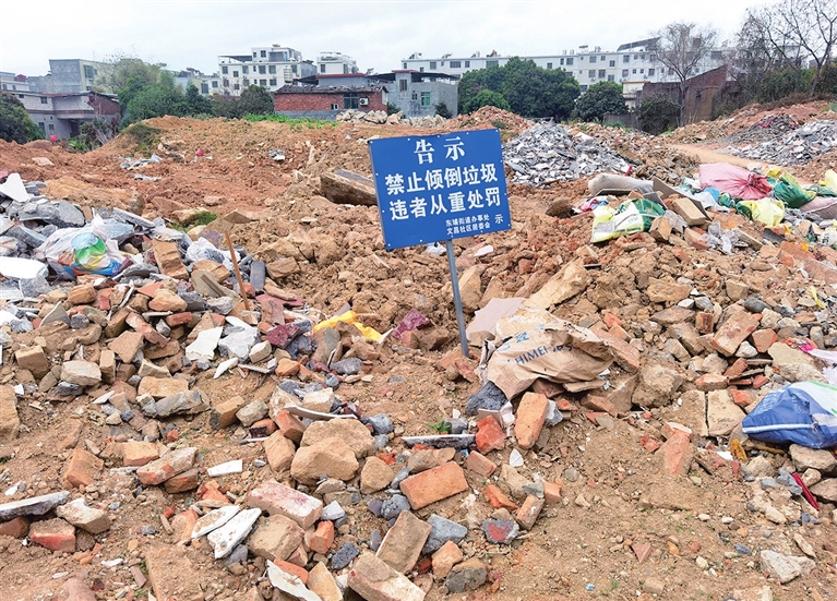 市民反映的路段是刚刚开通的新路段,路旁没有围挡。在这片空地上,有东埔街道办事处、文昌社区居委会竖立的“禁止倾倒垃圾,违者从重处罚”告示牌。但随意倾倒垃圾现象屡禁不止,只见空地上散落着渣土、混凝土块、碎瓦砖块、烂麻袋等各种垃圾,散发着阵阵呛鼻的气味。周边居民表示,垃圾随意堆放影响市容环境,希望有关部门尽快处理,给市民营造一个干净整洁的生活环境。