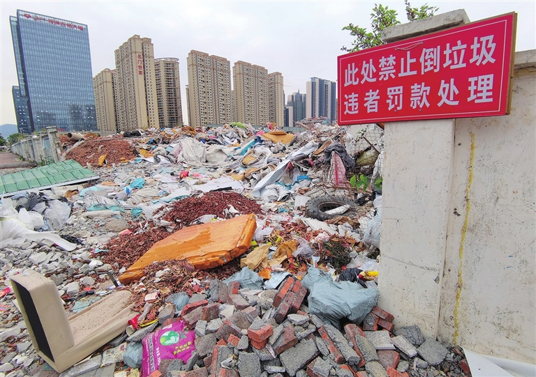 记者来到市民反映的路段发现,空地上围墙已经被拆得参差不齐,空地上堆放着废弃家具、碎瓦砖块、生活垃圾等,有些垃圾还散落到人行道上,散发出种种刺鼻的气味。附近居民表示,此处的围墙被破坏了,周边很多装修的废料垃圾都倾倒此处,久而久之这里就垃圾成堆了,一到下雨天就恶臭难闻。他们希望相关部门加大监管力度,尽快还居民一个舒适的环境。本报记者 肖斌 摄