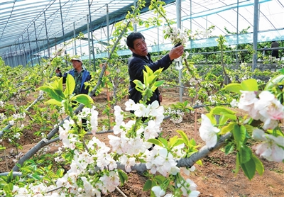 ■3月21日,秦皇岛市山海关区石河镇石河大樱桃专业合作社社员在大棚内给樱桃树疏花。