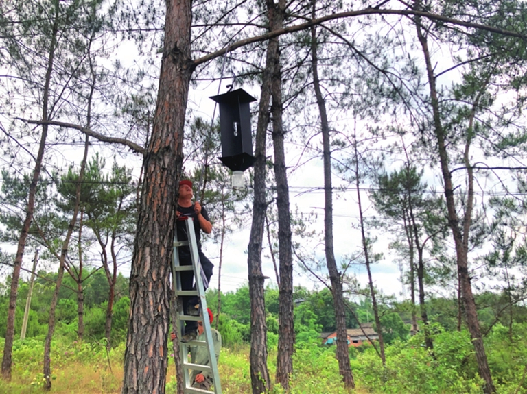 “2号诱捕器捕获松褐天牛18只。”“3号诱捕器还多些,有20多只,效果真不错。”2020年5月,在我市各大林区防治点,技术人员不畏炎热挂起了“灯笼”,和真正的灯笼比较,这些“灯笼”个头稍大,高约1米,直径30多厘米,下方还悬挂着透明的集虫瓶。“灯笼”学名叫松褐天牛诱捕器,悬挂在诱捕器内的药包,散发出特殊气味,吸引松褐天牛等昆虫。天牛“闻香”而来撞上档板掉进集虫瓶后,就再也飞不出去。此次,我市各林区悬挂5000套“灯笼”,守护全市近20万亩松林,实现重点防控区域全覆盖,大大遏制松材线虫病的蔓延。