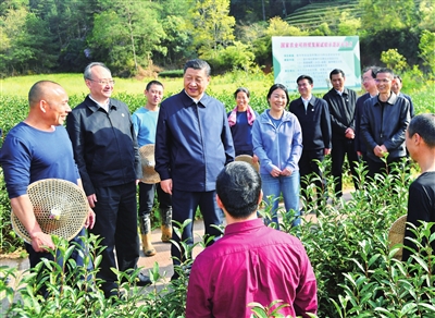武夷山是乌龙茶、红茶的发源地。习近平来到星村镇燕子窠生态茶园,察看春茶长势,了解当地茶产业发展情况。习近平强调,要统筹做好茶文化、茶产业、茶科技这篇大文章,坚持绿色发展方向,强化品牌意识,优化营销流通环境,打牢乡村振兴的产业基础。要深入推进科技特派员制度,让广大科技特派员把论文写在田野大地上。