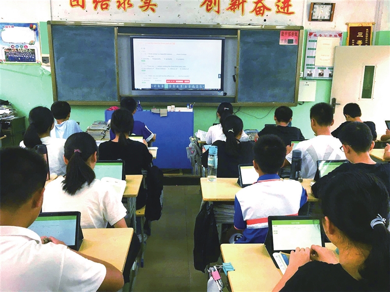 走在该校教学楼里,有个特殊的班级引起记者的注意:课堂上师生人手一台平板电脑,通过平板电脑完成教学工作、习题讲评,整个课堂氛围十分活跃。