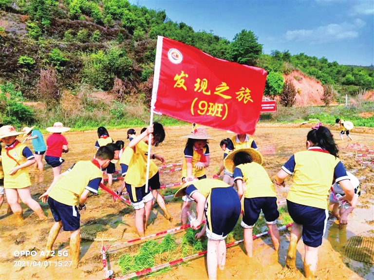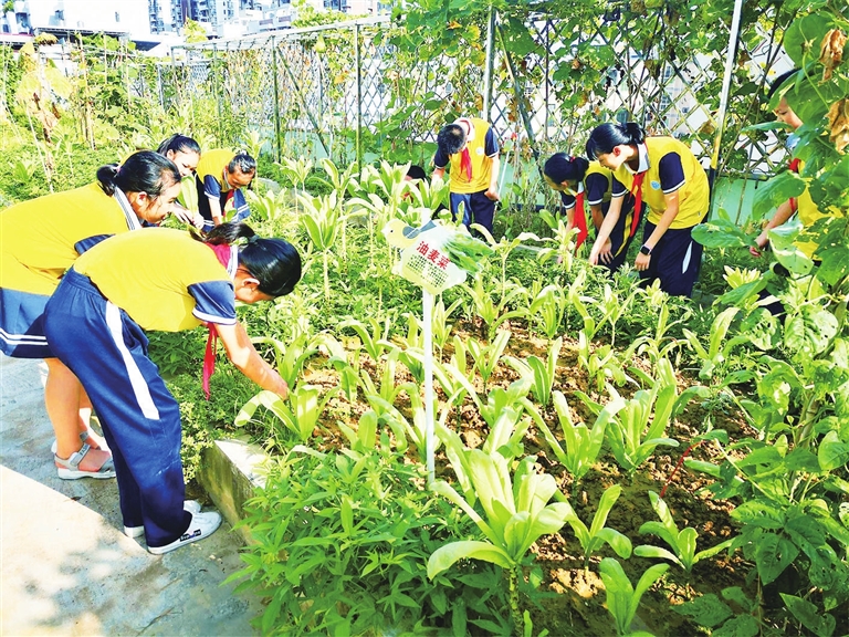 地处市区,要寻找一块农耕用地是很困难的。然而市三小别出心裁,在教学楼楼顶开辟了总面积约1000平方米的“开心农场”,配套了400平方米的“开心食堂”实践基地。该校在充分利用这两块阵地的基础上,开设“生活性+服务性+创造性+生产性”劳动教育体系。通过让学生掌握日常生活自理、个人清洁卫生的劳动技能,感知劳动乐趣;主动分担家务、班务、校务、社会服务的公益劳动项目,学会与他人合作劳动,体会劳动光荣;参与菜园耕种,体验种植瓜果蔬全过程,感知劳动乐趣;通过手工制作、科技创作、美食烹饪等活动,感悟劳动创造美好未来。