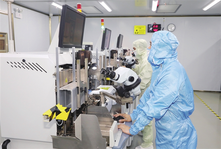 河源高新区的新一代通信及万物互联应用芯片及模组科技成果转化中试基地的无尘车间内,一台台精密仪器正开足马力,通过复杂的封装工艺流程加工生产出一颗颗先进的芯片及模组。