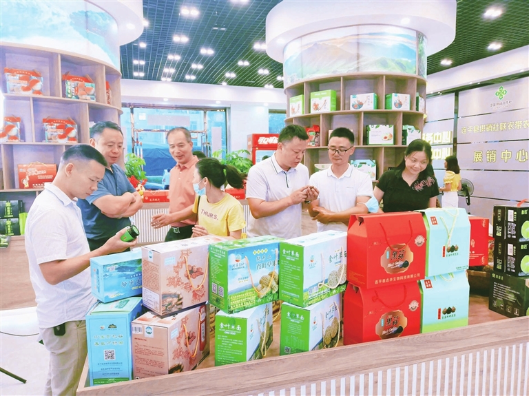 ■金秋时节,瓜果飘香。近日,由深圳对口帮扶连平工作组组织,庆祝2021年中国农民丰收节连平分会场活动在连平县农产品电商服务中心开幕。活动展示了连平县13个镇179个村“悦农”电商平台225种农副产品,深圳市对口帮扶连平的9个驻镇帮镇扶村工作队40多家单位代表参加了活动。活动现场,除了直接购买,还通过腾讯视频与主会场连线直播,把“一县一业”“一村一品”的好产品推向全国,推动“帮扶农产品”向高品质好品牌华丽蜕变。通讯员 李红华 摄
