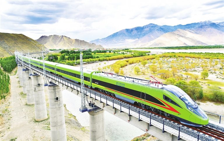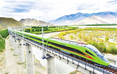 ■这是试运行的复兴号列车行驶在西藏山南市境内(6月16日摄)。6月25日,全长435公里、设计时速160公里的拉林铁路建成通车,西藏首条电气化铁路建成,同时复兴号实现对31个省区市全覆盖。新华社 发