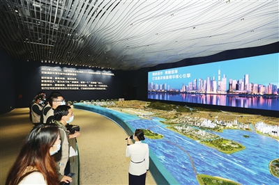 走进前海展示厅,首先映入眼帘的“敢为天下先,做第一个‘吃螃蟹’的人”标语格外引人瞩目。沙盘前,采访团的记者们详细了解了前海发展情况。作为“特区中的特区”,11年来,前海由昔日一片不起眼的滩涂地,蝶变成为粤港澳大湾区、深圳先行示范区建设新引擎,新时代改革开放新高地,现代服务业创新发展新动力,国际化城市新中心,成为我国发展最快、质量最高、效益最好的区域之一。数据显示,2020年前海深港现代服务业合作区注册企业增加值同比增长13%,比2013年增长51倍;税收收入同比增长13.4%,比2013年增长92倍。