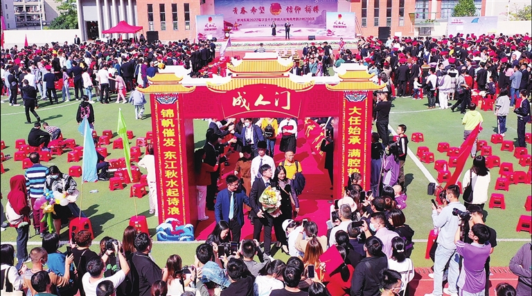 成人礼上,师生们共同学习了习近平总书记对青年的寄语,老师为学生颁发“成人证书”《中华人民共和国宪法》,家长为孩子冠戴“成人帽”、佩戴成人纪念章,全体学生面向国旗庄严宣誓。现场师生、家长与孩子间互送礼物。随后,孩子们携手家长,迈过“成人门”。
