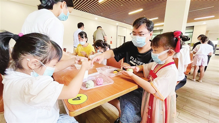 前天是中国传统节日中秋节,市图书馆开展“弘扬传统文化 共话团圆中秋”活动,小读者们以亲子组合的方式DIY制作冰皮月饼,亲身体验传统习俗。“中秋节一般是在什么时候?”“过中秋要吃什么呀?”……活动导师先给小读者们科普中秋节的历史、节日习俗等知识,接着教孩子们如何制作月饼。这一天制作的是冰皮月饼,揉团、摊面、包馅、压形、脱模……孩子们跟着老师的步骤,在爸爸妈妈的协助下,做成了一个个花纹各异的月饼。