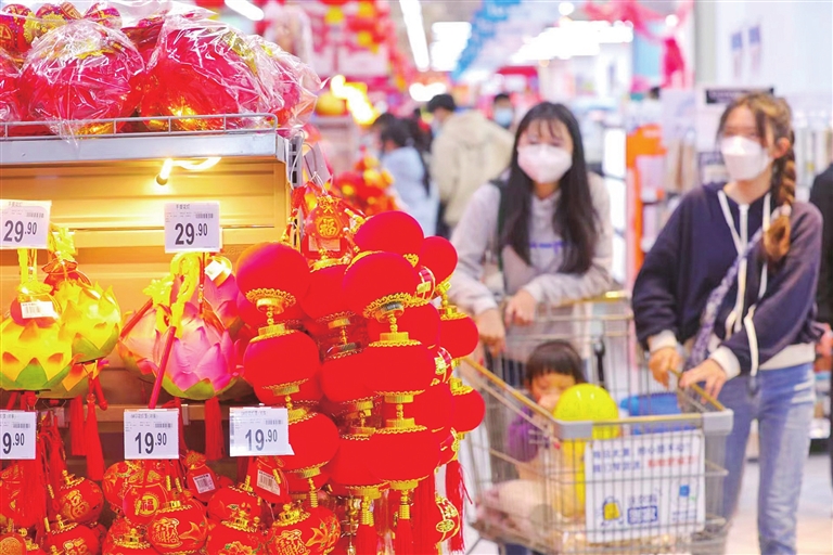 近期,市区万隆城购物中心人流逐渐旺盛,沃尔玛超市早早换上了“新年装”,年菜食品、年菜礼盒、零食礼盒有了专柜,春联、兔年吉祥玩偶也有了专属区域,新年氛围感直接“拉满”;餐饮区的多家餐厅坐满了食客,部分餐厅还出现排队等位的情况。