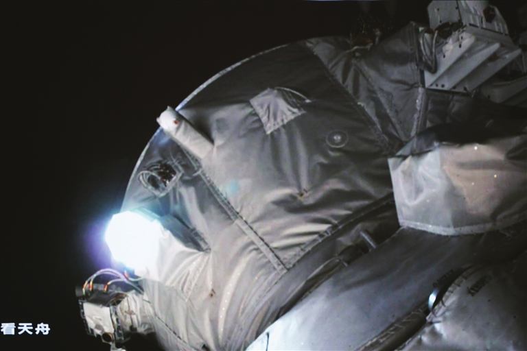 5月11日在北京航天飞行控制中心拍摄的天舟六号货运飞船与空间站组合体完成交会对接的画面。