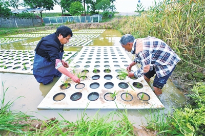 ■近年来,在湖南省长沙市望城区高塘岭街道湘江村,当地农民利用“水上种植”技术,在池塘的水面上进行水稻、蔬菜、花卉种植,使鱼虾与水稻、蔬菜、花卉共生互补,通过“一水两用、一水两收”,实现资源和空间的充分利用,助力农民增产增收。