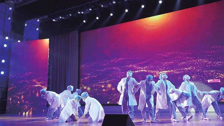 晚会以乐队演唱《曾经的你》《无尽光芒》拉开序幕,舞蹈《出征》《最美的逆行者》等演绎了白衣天使们在抗击疫情这场没有硝烟的战争中披上“铠甲”,为战“疫”出发,奔跑在抗击疫情的最前沿(如图,朱景优 摄)。诗歌朗诵《杏林四章》、小品《绿码》、舞蹈《灯火里的中国》等节目精彩上演,展现了全县医务工作者爱岗敬业、无私奉献的良好精神风貌。