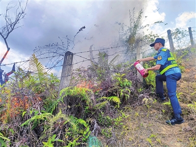 事发当天13时许,路政员接警后,到达现场发现着火山坡烟雾弥漫,杂草被烧得噼啪作响,大火借助风势肆意蔓延,浓烟随风飘向高速公路,时刻影响过往车辆行驶安全。路政员立即靠边停车并做好安全围蔽,打开车载警报器,提醒过往车辆减速慢行,并拎起随车灭火器,翻越护栏冲上边坡灭火。经过近10分钟的奋力灭火,现场火势得到控制。随后,紫金县消防救援大队消防员赶到现场,用高压水枪将残余火苗彻底扑灭。
