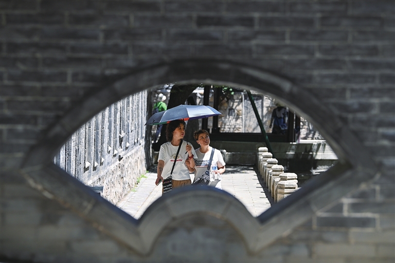 | ■游客在晋祠游览(7月4日摄)。晋祠是祭祀西周初晋国首任诸侯唐叔虞的祠堂,位于山西省太原市西南25公里处的悬瓮山麓、晋水源头,这里依山傍水、古木参天,百余座殿、堂、楼、阁、亭、台、桥、榭点缀于山光水色之间,是集中国古代祠祀建筑、园林、雕塑、壁画、碑刻艺术于一体的千年古祠。新华社 发 |