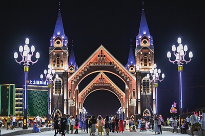 | ■在新疆布尔津县七彩河休闲旅游度假区,游客在喀纳斯塔桥观光游览(7月18日摄)。夜幕降临,在新疆阿勒泰地区布尔津县七彩河畔,3D全息投影技术水幕全息灯光秀表演吸引大批游客驻足观看。