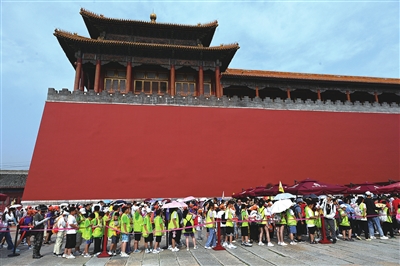 | ■ 7月20日,未成年人团队排队等待进入故宫。为应对暑期客流高峰,北京故宫博物院开始受理未成年人团队预约参观申请,对未成年人占85%以上的暑期未成年人团队开放快速预约和入院通道。为了保障参观安全和参观质量,故宫要求团队的未成年人不能超过30人、成年人与未成年人比例不得低于1:10、总人数不得超过35人。 新华社 发 |