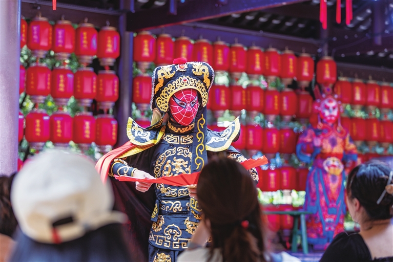 | ■7月19日,在四川省成都市人民公园,演员为观众表演川剧变脸。