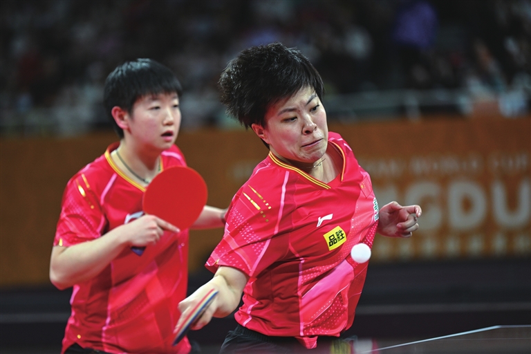■12月5日,中国队组合孙颖莎/王艺迪(右)在女双比赛中。她们以1比0战胜波多黎各队组合阿德里安娜·迪亚兹/梅拉妮·迪亚兹。