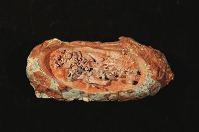 这些展出的恐龙蛋化石中,两枚白垩纪窃蛋龙胚胎蛋化石尤为罕见。这两枚胚胎蛋化石原出土地为江西赣州。其中一枚长17.3厘米,呈长条形,胚胎发育较为成熟,保存状态完好,未受到石化作用的过多干扰,精细修复后清晰展现了该胚胎的骨骼分布情况和存活时的姿态;另一枚长18厘米,虽未修复,但仍可见部分骨骼。