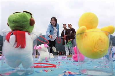■5月1日,游客在贵州省剑河县仰阿莎文化广场参加趣味游戏活动。