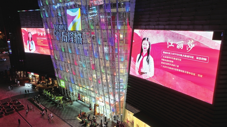 昨晚,市区万隆城大屏幕为教师节亮灯。为大力弘扬尊师文化,引导社会各界感念师恩、礼敬教师,努力营造浓厚的节日氛围,我市各大商超连续2天为教师节亮灯。 本报记者 冯晓铭 摄