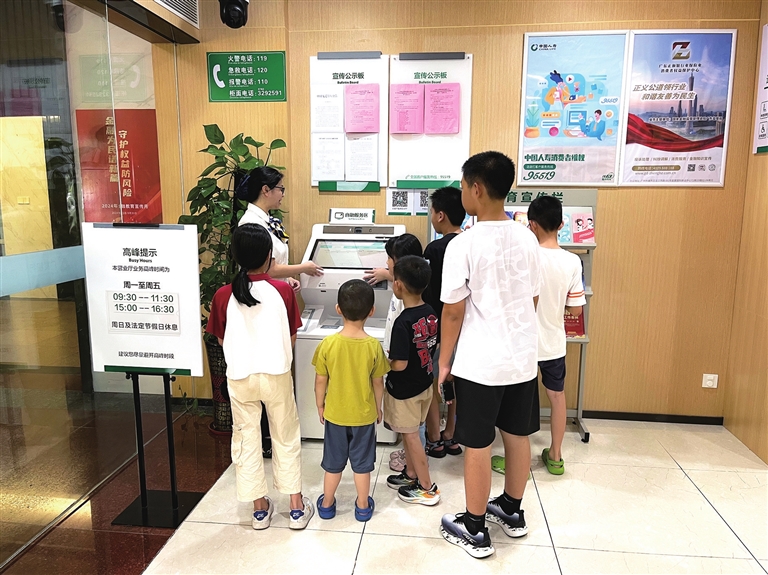 活动当天,工作人员带领小朋友们参观柜面,了解智慧柜员机、业务窗口运作等,并为小朋友示范柜员服务接待礼仪及流程,邀请小朋友进行“小小柜员”体验,模拟柜面服务过程,增强保险工作体验感。随后,小朋友们观看反诈宣传视频,并通过参与互动小游戏、问答、创意绘画活动等形式进行金融知识教育宣传,提升小朋友反诈意识。
