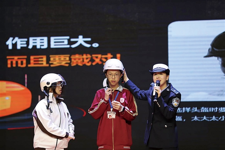 ■在河源市东华实验学校,河源交警为学生们带来《摩电驾驶人》交通安全宣讲,现场演示如何正确佩戴头盔。