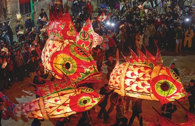 ■2月12日晚,村民在安徽省黄山市歙县溪头镇汪满田村嬉鱼灯。
