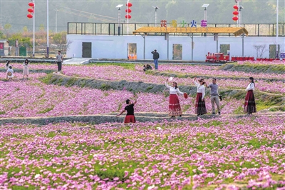 当下,正值春季踏春时节,东源县义合镇下屯村60亩格桑花已到盛花期,不少市民在浪漫花海中游玩、拍照。