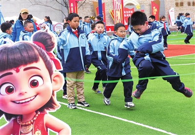 ■2月17日,学生们在新疆乌鲁木齐市第十三小学操场上跳绳。当日,全国各地举办了多种多样的“开学第一课”主题活动。新华社 发