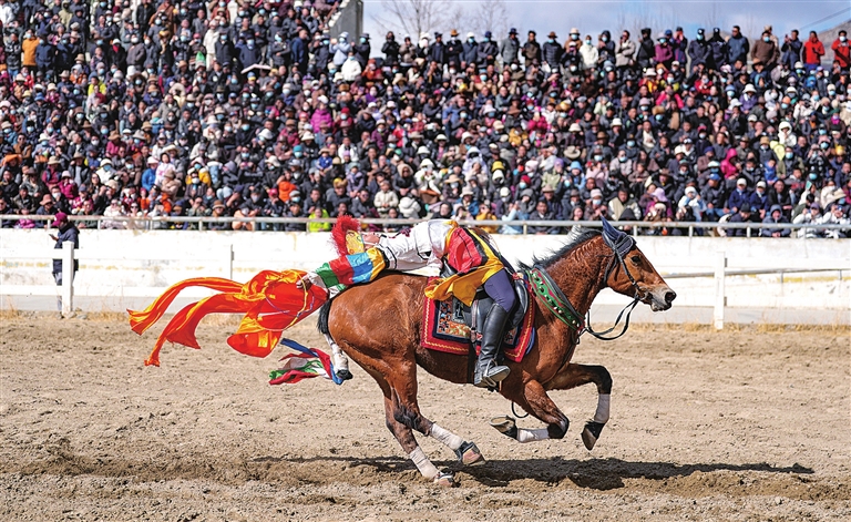 ■3月2日,马术队员在表演传统马术项目捡哈达。