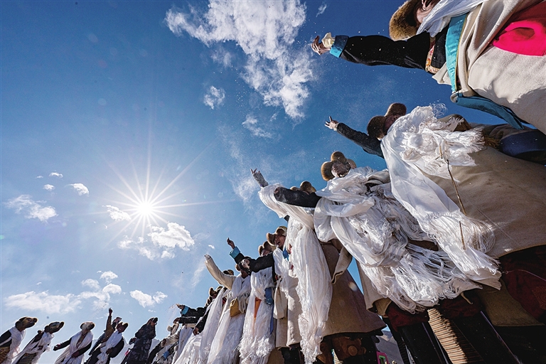 ■3月16日,在拉萨市林周县春堆乡春耕典礼现场,农机驾驶员向天空撒糌粑祈愿丰收。