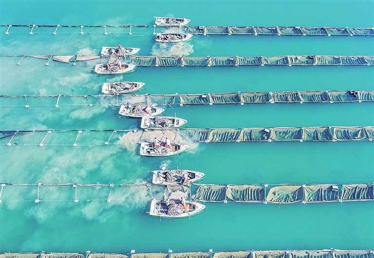 春分时节,在山东省荣成市天海湾海洋牧场海参养殖区,渔民们驾驶渔船开展海参苗管护作业。目前,荣成市海参养殖面积近23万亩,年产值超60亿元,海参养殖已成为当地渔业增效、渔民增收的支柱产业之一。新华社 发