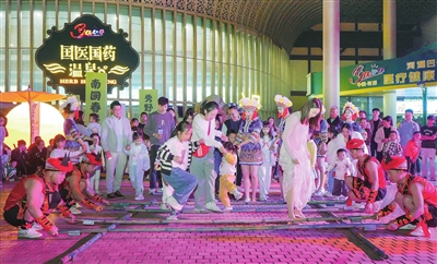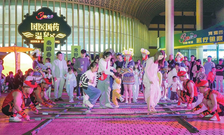 ■伴随着明快的节奏,源城区巴伐利亚庄园里的游客们欢快地跳起竹竿舞。